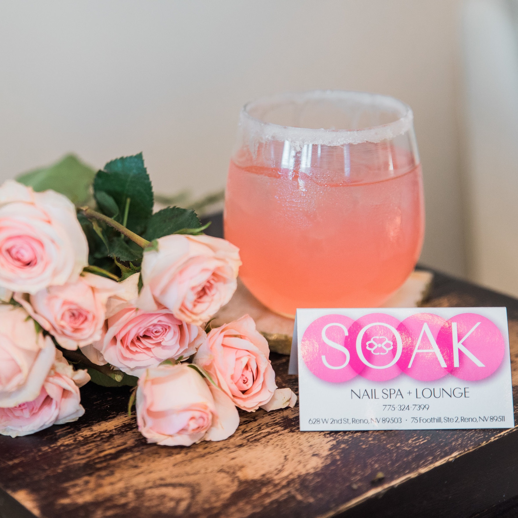 The Soak experience features tools autoclaved after each use, pumice bars and buffers that are never re-used, fresh flowers and, oh yes, custom cocktails.